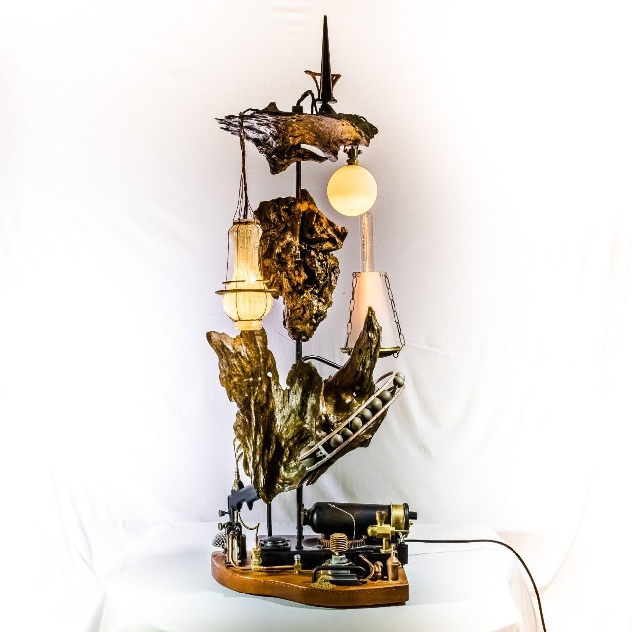 Dispositivo de Aveiro | 2022 | Técnica Upcycling / Materiais: driftwood, partes de lustre antigo, cobre, latão, aço, sementes, azeite de oliva, vidro, bijuterias, castiçal em prata, além de criativo easter egg que só será revelado ao comprador.